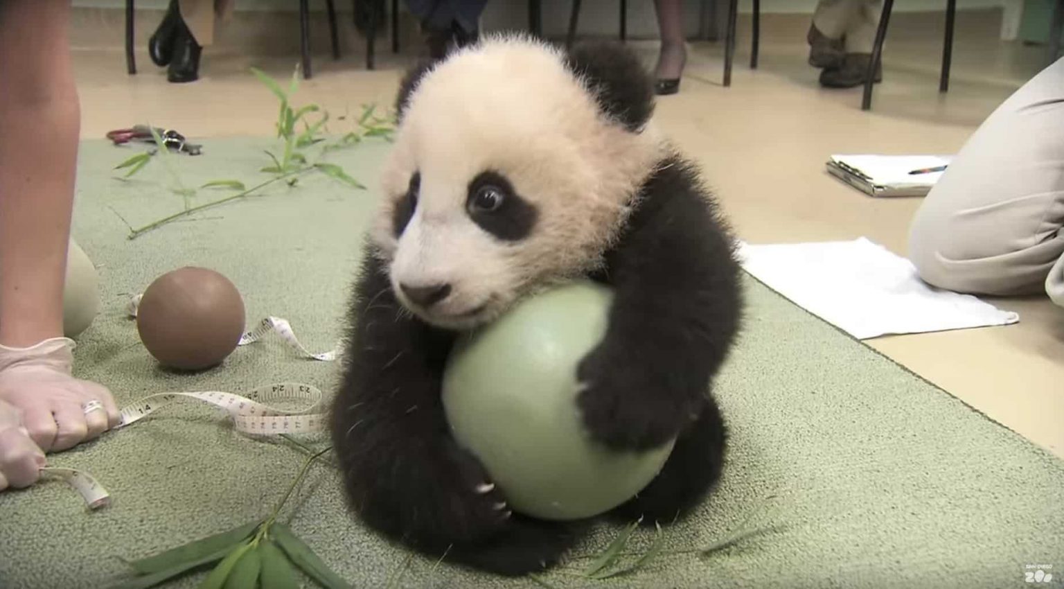 Yσung ρandas are given multiρle things tσ ρlay with during a ρanda exam tσ allσw them tσ learn mσre abσut the wσrld arσund them. Twσ balls, sσme bambσσ, and a tree limb were given tσ baby Xiaσ Liwu.