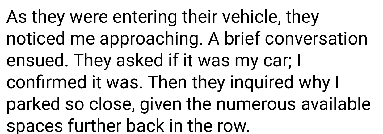 In the end, this incident isn’t merely about who’s at fault for a tight parking spot—it’s about how we manage shared spaces and respect one another’s property. While our OP did nothing wrong by parking correctly, the dispute underscores the importance of proper vehicle placement and open communication among drivers. What do you think? Have you ever faced a similar parking spat, and how did you handle it? Share your thoughts and join the discussion below.