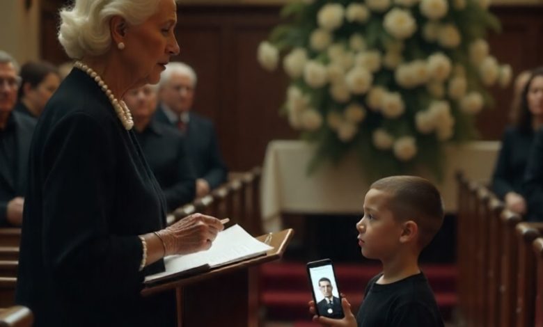 At my husband’s memorial, his mother raised her chin and said coldly, “At least he isn’t here anymore to face her shame.” Around the chapel, relatives nodded in silent agreement. Then something happened that no one expected. My 8-year-old son stood up, clutching his dad’s phone tightly. His voice rang out, “Grandma, should I show everyone what Dad recorded about you last week?”