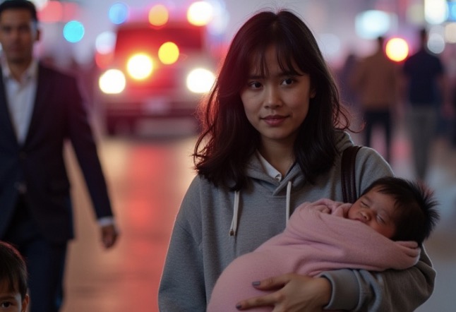 They stepped into the lobby. Firefighters turned and froze—just for a heartbeat. In that single beat, the crowd outside saw a picture they would not forget: a young woman streaked with soot, hair damp with sweat, a pink-blanketed baby locked under her chin, and a frightened boy clinging to her side.