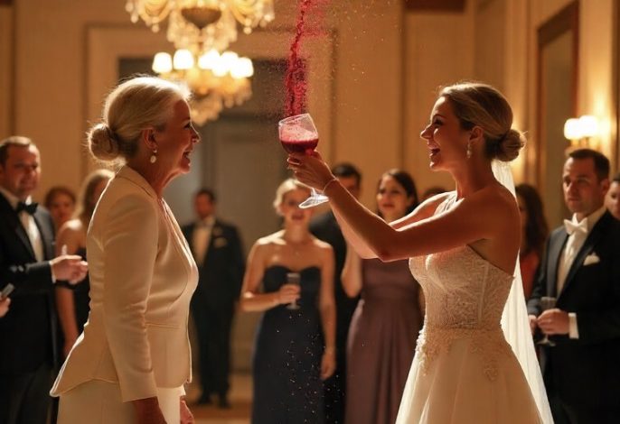 Then, with one dramatic flick of her wrist, she “accidentally” tossed her entire glass of red wine straight at me. The liquid hit me square in the chest, soaking the silk, and gasps filled the room.