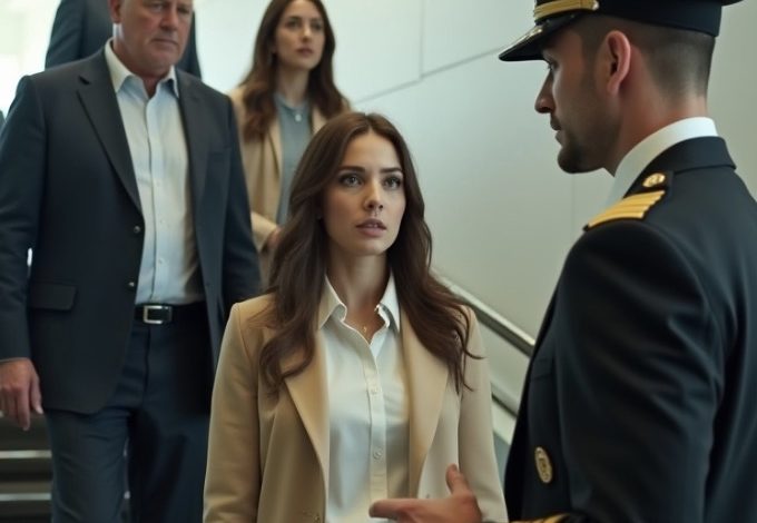 A few minutes passed. Travelers rushed around me. Children cried. Suitcases rolled. Then, the noise seemed to fade. I saw a tall man in a navy-blue uniform walking straight toward me. He stopped and spoke with a firm, respectful tone.