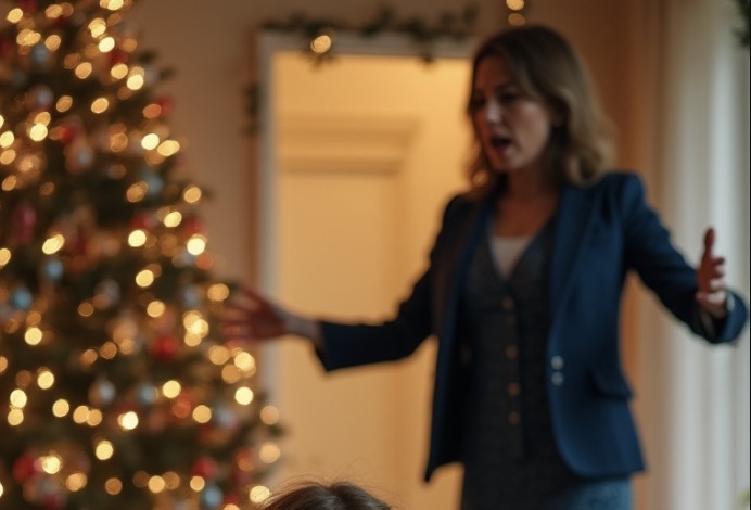 The Christmas tree was leaning like it had survived a hurricane. Shattered ornaments covered the carpet. Food stains dotted the tablecloth. Wrapping paper was everywhere.