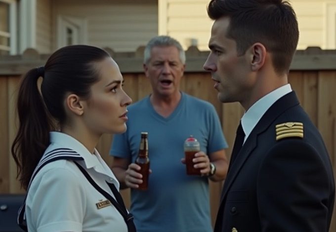 That morning, I had come straight from a change-of-command ceremony in Washington, D.C. I didn’t even have time to stop at quarters. I was still in my service dress whites, the kind of uniform that made people stand straighter and whisper even when you didn’t want them to. The brass gleamed, the stripes shone, and I smelled faintly of jet fuel and polish. It wasn’t exactly the right outfit for a backyard barbecue. But I was too tired to change—and too stubborn to explain.