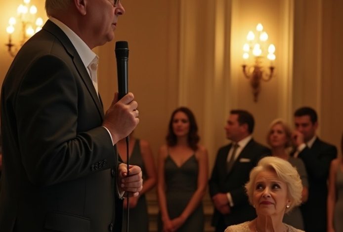 He stood up slowly, pushing his chair back. The murmur of conversation stopped. He straightened his jacket, walked to the front of the hall, and reached for the microphone. His hands were strong, rough from years of labor, gripping the stand with quiet determination.