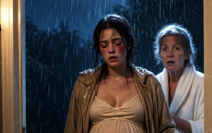 Her face broke me. A swollen bruise was forming under her right eye—deep purple and sickening. Her lip was split, blood dried at the corner. Her hair was soaked and tangled, sticking to her cheeks. She was wearing nothing but a nightgown under a thin coat thrown on in a hurry, completely soaked by the icy March rain. Her slippers were drenched, leaving small puddles on the doorstep.