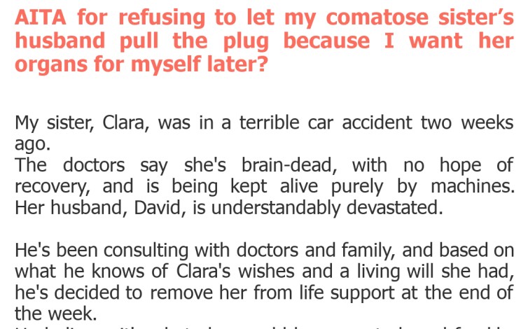 "AITA for refusing to let my comatose sister’s husband pull the plug because I want her organs for myself later?"