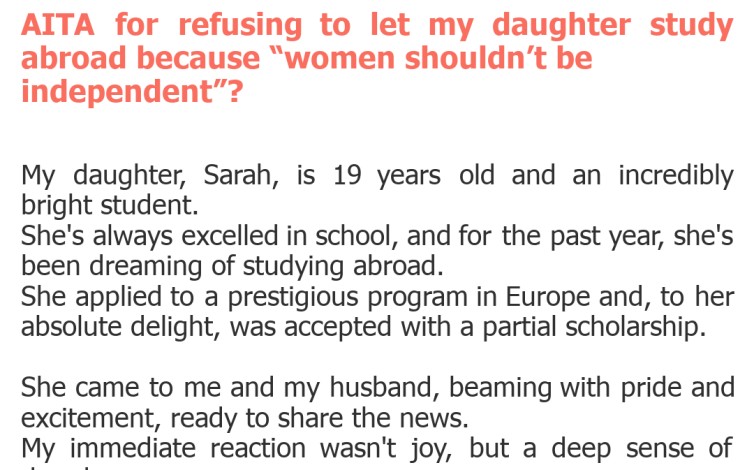 The core of the conflict lies in the explicit statement: "women shouldn’t be independent." While parental guidance and concerns for safety are understandable, framing it as a gender-specific restriction rather than a universal concern for any young adult traveling abroad shifts the ethical landscape significantly. It implies a belief that women are inherently less capable or less deserving of the self-reliance that such an experience fosters, which can be profoundly disempowering.