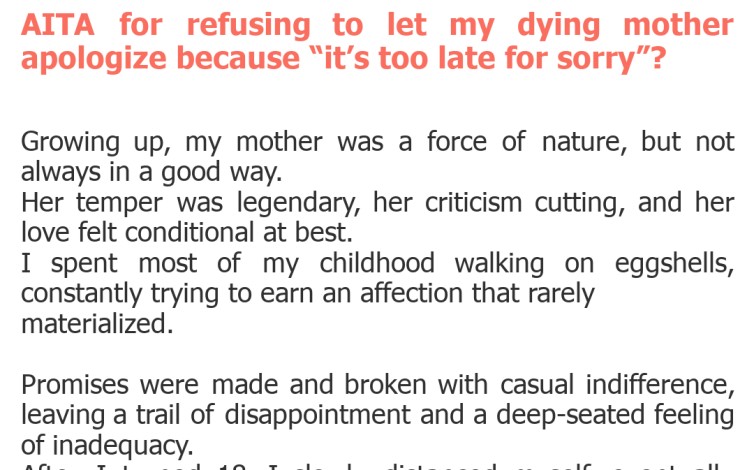 "AITA for refusing to let my dying mother apologize because “it’s too late for sorry”?"