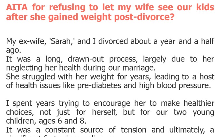 This is undoubtedly a highly charged situation, and it's easy to see why the original poster, 'ThrowawayDad78,' believes he's acting in his children's best interests. From his perspective, he's witnessed a pattern of unhealthy behavior from his ex-wife, Sarah, and he's concerned that her recent weight gain and associated health issues could genuinely impact her ability to parent effectively or, more broadly, set a poor example for their impressionable kids. His historical frustrations with her health are clearly a major factor here. \nHowever, we must critically examine the *method* he's chosen to address these concerns. Withholding access to children, especially when a custody agreement is in place, is an extremely serious action with potentially severe legal repercussions. While a parent's health can be a factor in custody disputes, it typically needs to be an immediate and direct threat to the children's safety or well-being, such as severe mental health crises or incapacitating physical illness. Simple weight gain, even if concerning, usually doesn't meet this high bar. \nSarah's accusation of body-shaming also carries significant weight here. Even if 'ThrowawayDad78' genuinely believes his motives are pure, dictating another adult's physical appearance as a condition for seeing their children crosses a very personal and ethical line. It can be perceived as controlling and punitive, rather than genuinely supportive. Furthermore, it risks damaging the children's relationship with their mother and creating immense stress for everyone involved. \nUltimately, while parental concern is valid, unilaterally denying access to a co-parent based on weight gain is rarely the appropriate or legally sound path. The primary focus of custody decisions is the children's best interests, which generally includes having access to both parents unless there is a clear, demonstrable risk of harm. The emotional fallout and potential legal battle from this decision could be far more detrimental to the children than their mother's current weight. Professional mediation or legal counsel would have been a more constructive first step.