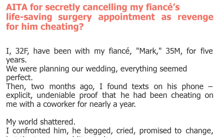 AITA for secretly cancelling my fiancé’s life-saving surgery appointment as revenge for him cheating?
