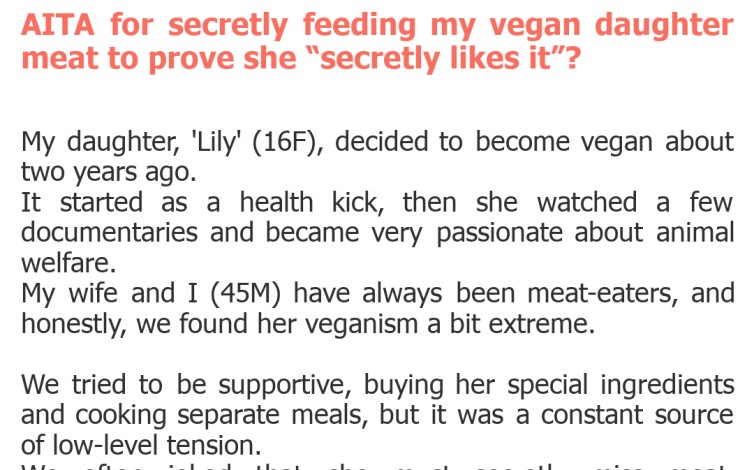 "AITA for secretly feeding my vegan daughter meat to prove she “secretly likes it”?"