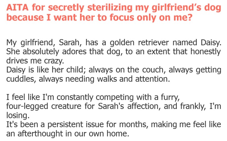 "AITA for secretly sterilizing my girlfriend’s dog because I want her to focus only on me?"