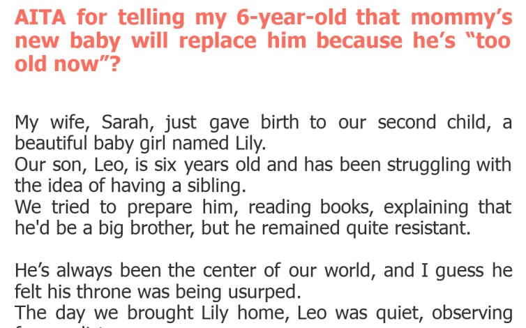 "AITA for telling my 6-year-old that mommy’s new baby will replace him because he’s “too old now”?"