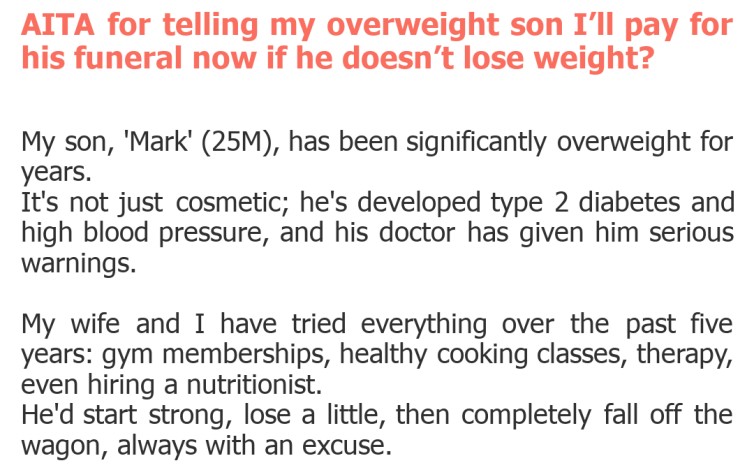 AITA for telling my overweight son I’ll pay for his funeral now if he doesn’t lose weight?