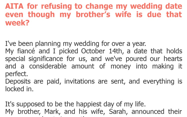 "AITA for refusing to change my wedding date even though my brother’s wife is due that week?"