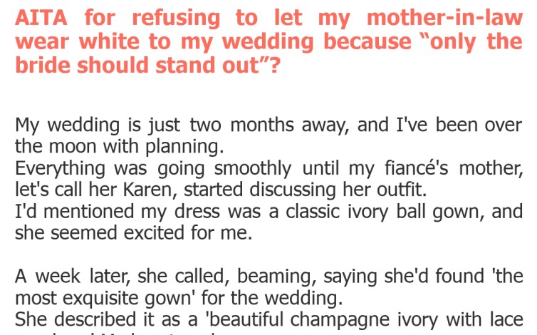 "AITA for refusing to let my mother-in-law wear white to my wedding because “only the bride should stand out”?"
