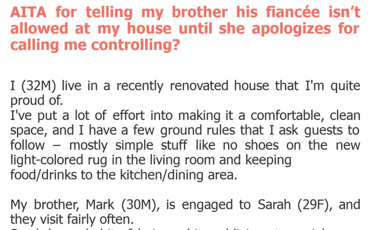 "AITA for telling my brother his fiancée isn’t allowed at my house until she apologizes for calling me controlling?"