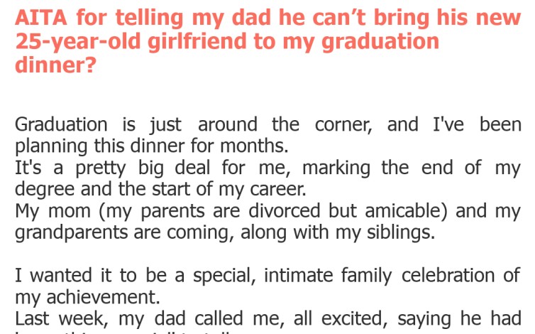 "AITA for telling my dad he can’t bring his new 25-year-old girlfriend to my graduation dinner?"