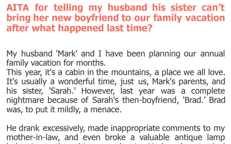 "AITA for telling my husband his sister can’t bring her new boyfriend to our family vacation after what happened last time?"
