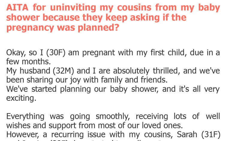 "AITA for uninviting my cousins from my baby shower because they keep asking if the pregnancy was planned?"