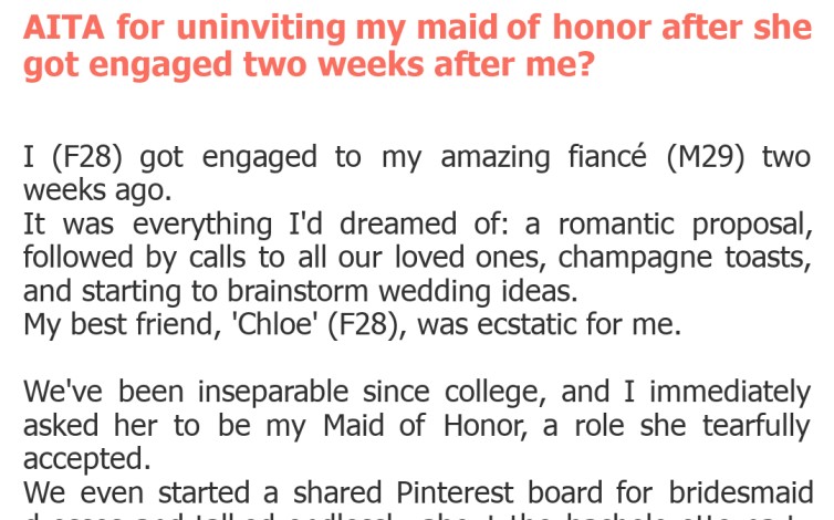 "AITA for uninviting my maid of honor after she got engaged two weeks after me?"