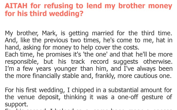 "AITAH for refusing to lend my brother money for his third wedding?"