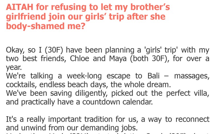 AITAH for refusing to let my brother’s girlfriend join our girls’ trip after she body-shamed me?