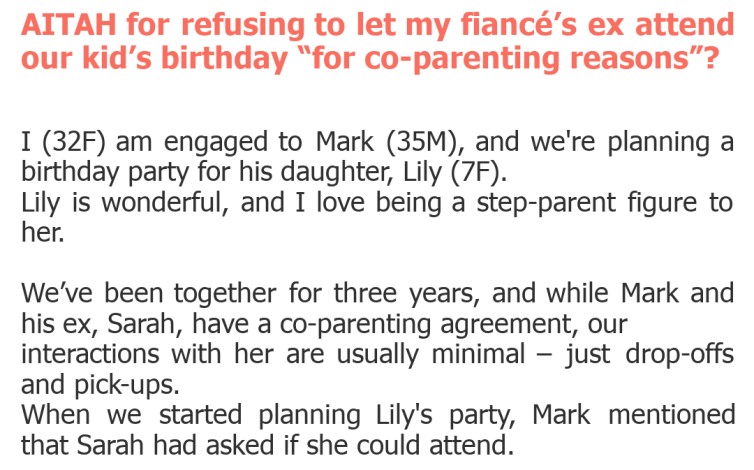 "AITAH for refusing to let my fiancé’s ex attend our kid’s birthday “for co-parenting reasons”?"