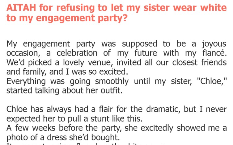 "AITAH for refusing to let my sister wear white to my engagement party?"