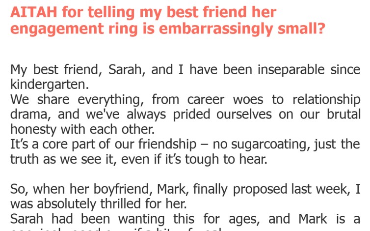 Oh, the complexities of best friendship! We all cherish those bonds where honesty is supposedly the best policy, where you can tell your closest pal anything without fear of judgment. But what happens when that 'anything' involves something as deeply personal and symbolic as an engagement ring? It's a tricky tightrope walk, navigating the line between genuine concern and stepping firmly into 'unsolicited advice' territory.\nToday's AITA story brings us exactly to this precipice. Our original poster (OP) found herself in a situation where her perception of her best friend's engagement ring clashed dramatically with what she believed was her duty as a friend. Was she truly trying to offer a dose of reality, or did she cross a line into shallow judgment? Let's dive into the glittering, albeit small, details.