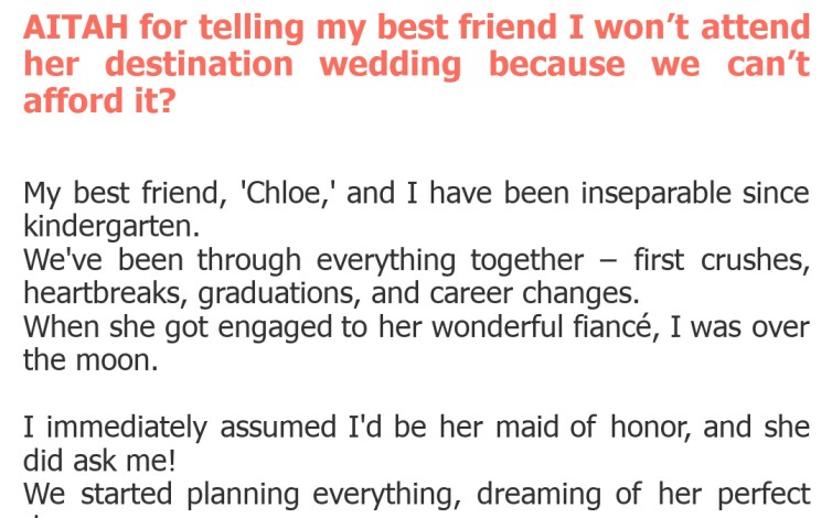 "AITAH for telling my best friend I won’t attend her destination wedding because we can’t afford it?"