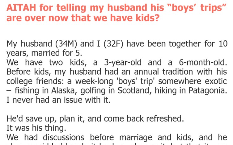 "AITAH for telling my husband his “boys’ trips” are over now that we have kids?"