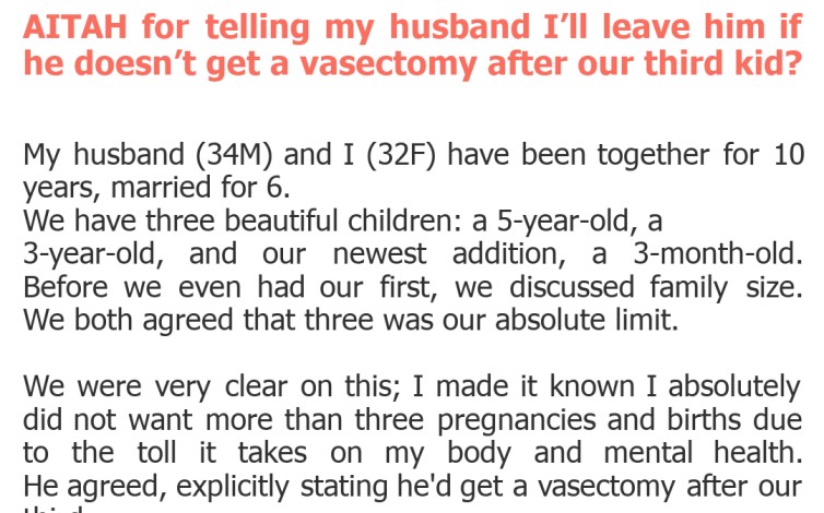 "AITAH for telling my husband I’ll leave him if he doesn’t get a vasectomy after our third kid?"