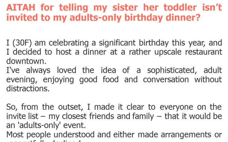 "AITAH for telling my sister her toddler isn’t invited to my adults-only birthday dinner?"