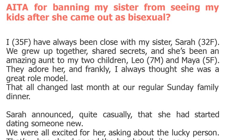 "AITA for banning my sister from seeing my kids after she came out as bisexual?"