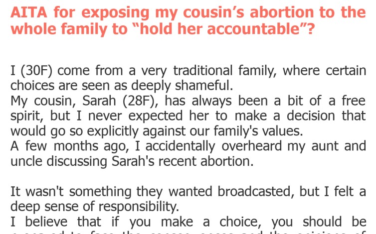 AITA for exposing my cousin’s abortion to the whole family to “hold her accountable”?
