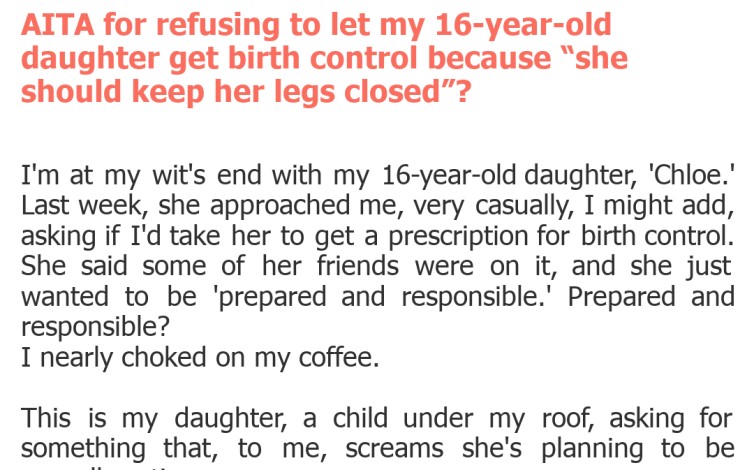 "AITA for refusing to let my 16-year-old daughter get birth control because “she should keep her legs closed”?"