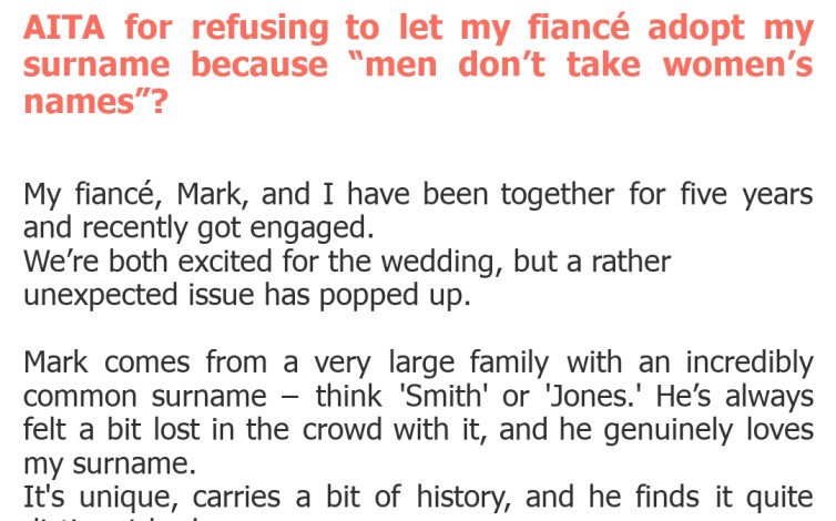 "AITA for refusing to let my fiancé adopt my surname because “men don’t take women’s names”?"