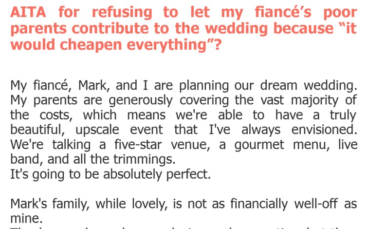 "AITA for refusing to let my fiancé’s poor parents contribute to the wedding because “it would cheapen everything”?"