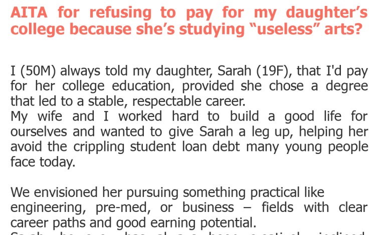 "AITA for refusing to pay for my daughter’s college because she’s studying “useless” arts?"