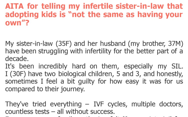 "AITA for telling my infertile sister-in-law that adopting kids is “not the same as having your own”?"