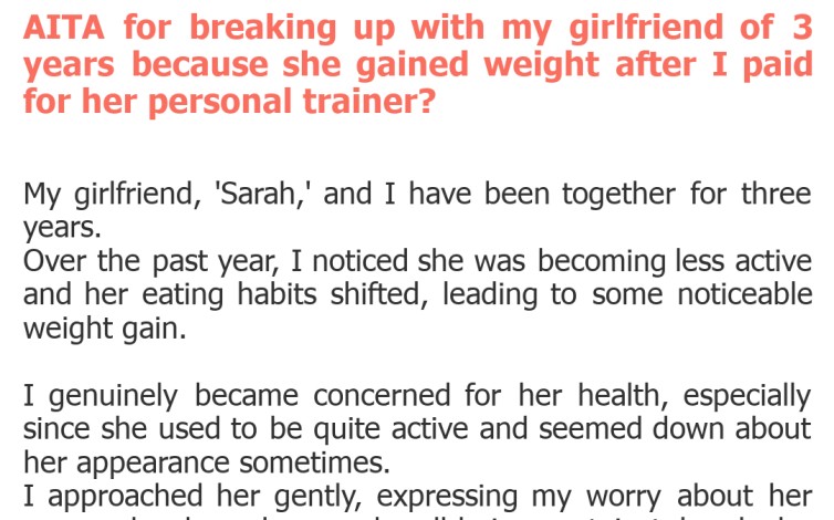 Ultimately, the breakup wasn't just about weight gain; it seems to be about a perceived lack of commitment, follow-through, and respect for a shared understanding. Whether breaking up over this specific issue makes OP 'the asshole' depends heavily on individual interpretations of relationship responsibilities, personal boundaries, and the right to end a relationship when fundamental compatibility or respect seems to falter.