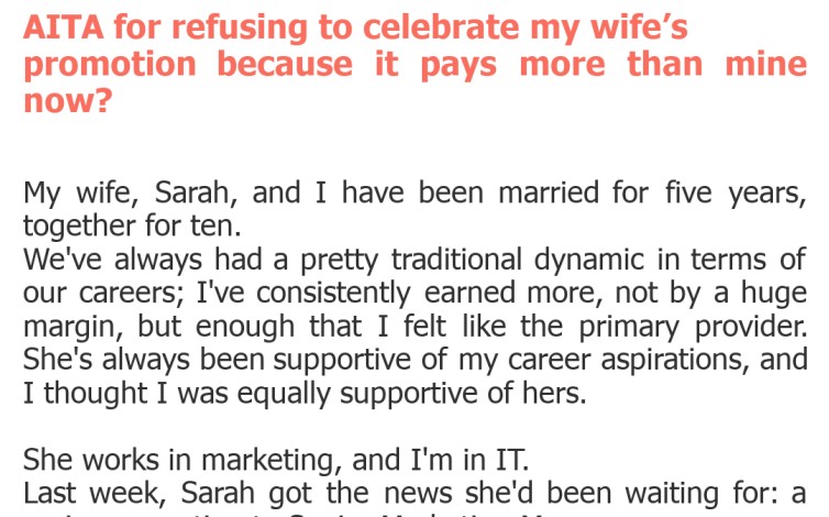 This week's AITA post brings us a husband wrestling with his own insecurities after his wife receives a significant promotion. While celebrating a partner's success should be a given, what happens when that success inadvertently triggers feelings of inadequacy and resentment? Our OP's dilemma highlights the delicate balance between personal pride and unconditional support. Let's peel back the layers and see where the community stands.