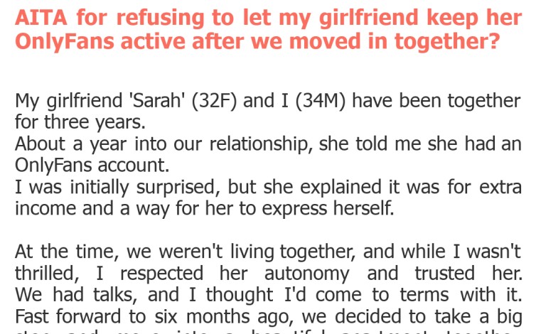 This week's story brings us a familiar yet ever-complex scenario. Our original poster (OP) is grappling with his girlfriend's OnlyFans account after they've taken the plunge into cohabitation. What was once perhaps an abstract idea or a known fact, has now become a very real, very present part of their shared life. The question isn't just about the platform itself, but about respect, trust, future compatibility, and the difficult art of compromise.