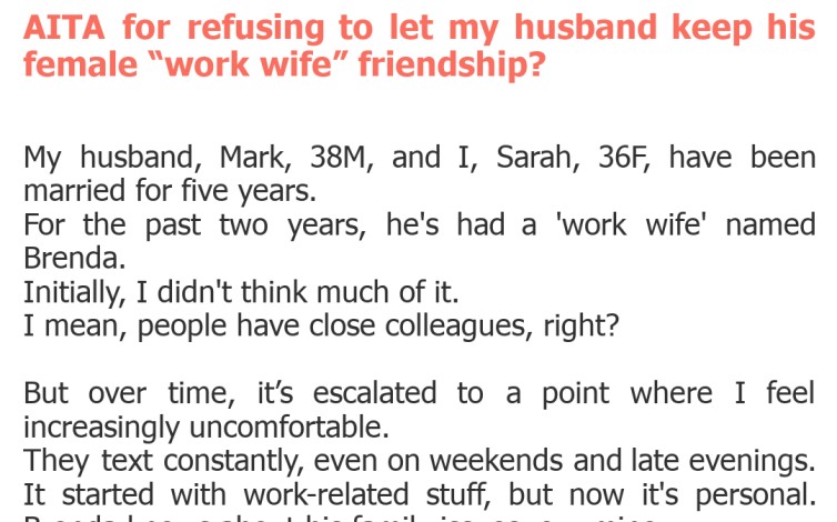 "AITA for refusing to let my husband keep his female “work wife” friendship?"