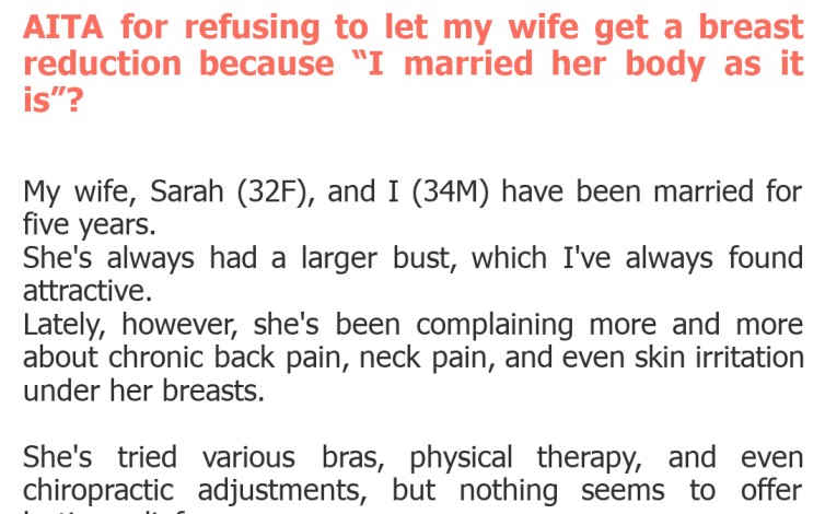 This story immediately thrusts us into a deeply uncomfortable territory regarding bodily autonomy within a marriage. On one hand, the wife, Sarah, is experiencing physical pain and discomfort, seeking a medical solution to improve her quality of life. Her pursuit of a breast reduction isn't purely cosmetic; it's health-driven, aiming to alleviate chronic issues that significantly impact her daily well-being. This context is crucial, as it elevates her desire beyond mere preference.
