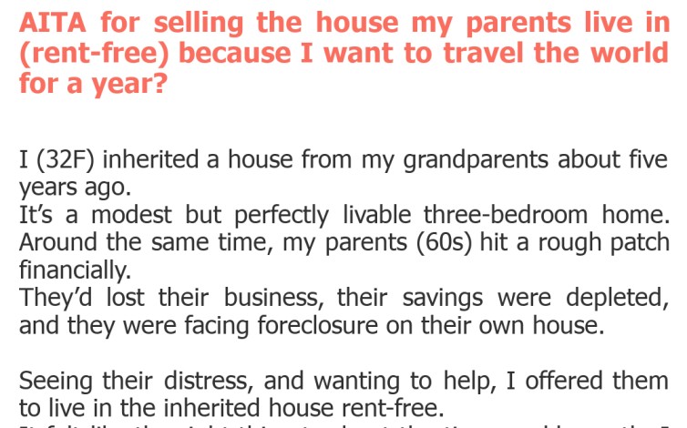"AITA for selling the house my parents live in (rent-free) because I want to travel the world for a year?"