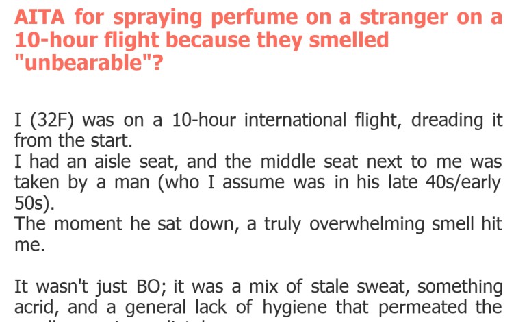 "AITA for spraying perfume on a stranger on a 10-hour flight because they smelled "unbearable"?"