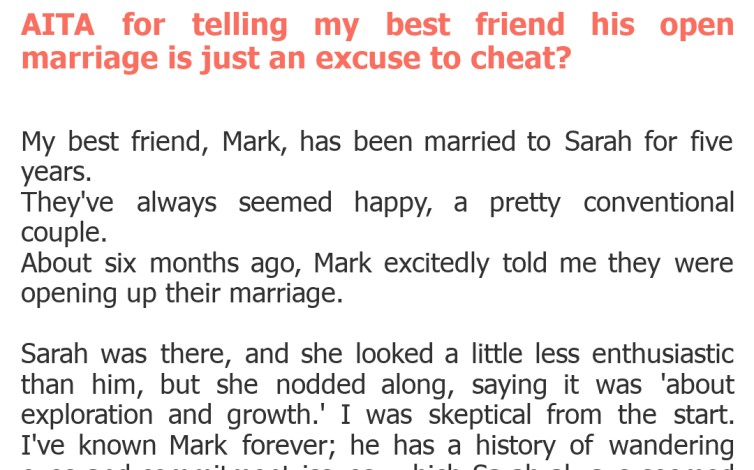 Alex watched his friend's journey into an open marriage unfold, harboring deep reservations about its true nature. What started as an agreement between Mark and his wife, Sarah, quickly began to look like something far less equitable in Alex's eyes. This isn't just about a differing lifestyle choice; it's about perceived motives and the potential for a friend to be hurt. Was Alex out of line for speaking his mind, or was he a true friend?